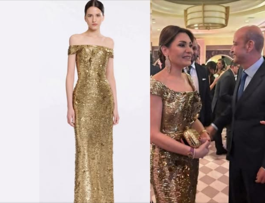 اختارت دينا طلعت الظهور بإطلالة اتسمت بالفخامة والجرأة في آنٍ واحد، إذ ارتدت فستانًا طويلًا باللون الذهبي اللامع، جاء تصميمه أنيقًا بقصة أوف شولدر أبرزت رشاقتها ومنحتها حضورًا مميزًا بين الحضور.