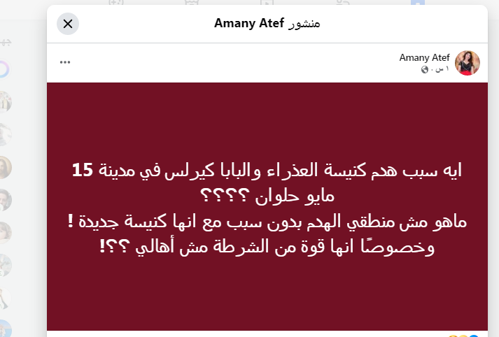 أثار قرار هدم كنيسة العذراء والبابا كيرلس السادس بمدينة 15 مايو التابعة لحلوان حالة واسعة من الجدل والغضب، خاصة بعد تنفيذ الإزالة بواسطة قوات الشرطة، رغم حداثة إنشاء الكنيسة، ما فتح الباب أمام تساؤلات عديدة حول أسباب القرار وتوقيته.