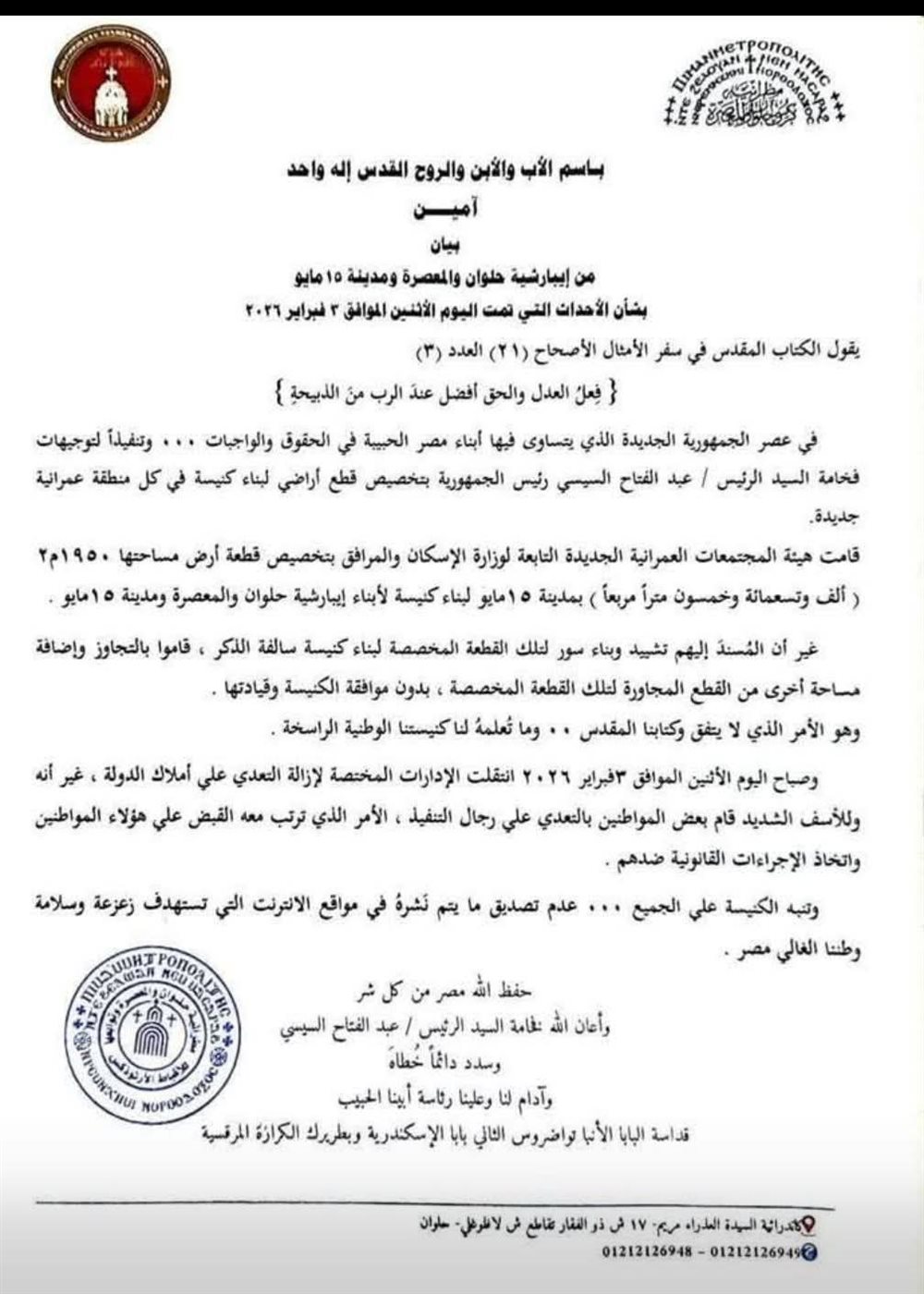 إيبارشية حلوان والمعصرة تصدر بيانا بشأن أحداث التعدي على أرض مخصصة لبناء كنيسة وتؤكد الالتزام بسيادة القانون