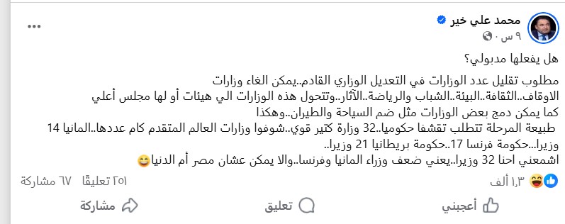 في تصريحات مفاجئة ، خرج الإعلامي محمد علي خير، بمنشور على صفحته الشخصية بمنصة فيسبوك، وطالب الحكومة المرتقب تشكيلها بإعادة تقييم هيكلها الوزاري، معتبرًا أن التوسع الحالي في عدد الحقائب الوزارية لا يتماشى مع متطلبات المرحلة ولا مع التجارب الدولية الناجحة في الإدارة الحكومية.