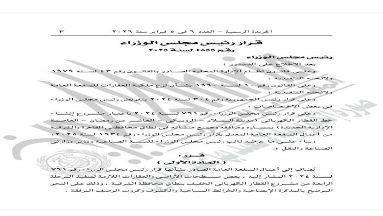 أعلنت الجريدة الرسمية في عددها الصادر بتاريخ 5 فبراير 2026، القرار رقم 4855 لسنة 2025، الصادر عن رئيس مجلس الوزراء، والمتعلق بتنفيذ المرحلة الرابعة من مشروع القطار الكهربائي الخفيف بمحافظة الشرقية.