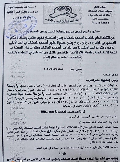 واختتم الاتحاد مذكرته بمطالبة رئاسية بإحالة مشروع القانون المقترح إلى مجلس النواب لمناقشته وإقراره، تمهيدًا لوضعه موضع التنفيذ.