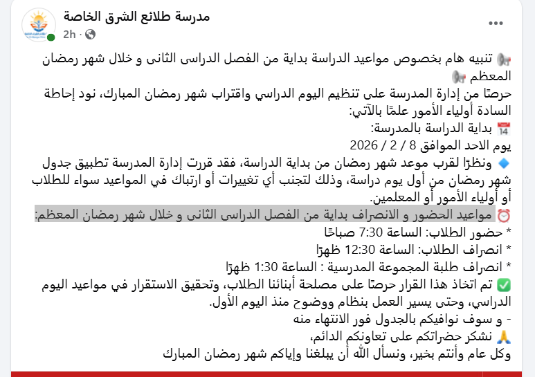 وفي السياق نفسه، حسمت إحدى المدارس الخاصة في المرج مواعيد الدراسة في شهر رمضان 2026، حيث تقرر: