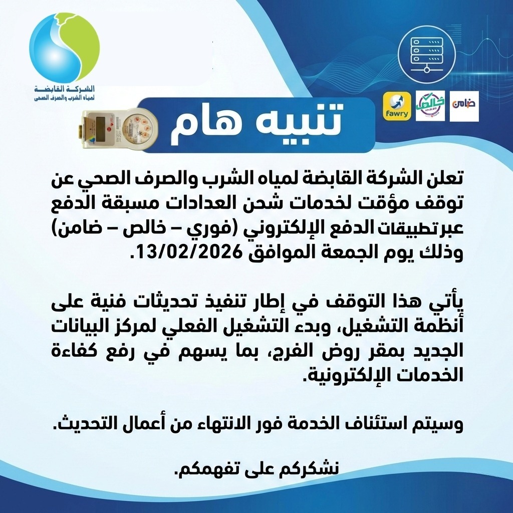 العدادات مسبقة الدفع .. أعلنت الشركة القابضة لمياه الشرب والصرف الصحي عن توقف مؤقت لخدمات شحن العدادات مسبقة الدفع عبر جميع منصات الدفع الإلكتروني، بما في ذلك تطبيقات فوري، خالص، وضامن، يوم الجمعة الموافق 13/02/2026 ، يذكر ان هذا الإجراء جاء بهدف تنفيذ تحديثات تقنية هامة على أنظمة التشغيل لضمان كفاءة واستقرار الخدمات.