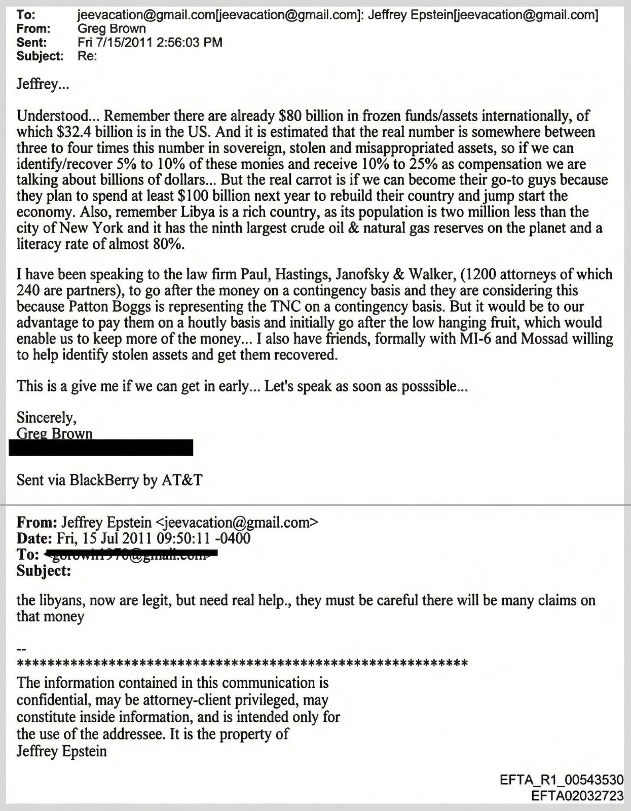 في أحدث فضيحة تورط فيها إبستين، كشفت وثيقة نُشرت مؤخرًا أن أحد شركائه، يدعى جريج براون تآمر مع رجل الأعمال الأمريكي إبستين عام ٢٠١١ للوصول إلى الأصول السيادية الليبية المجمدة والاستيلاء عليها. نُفذت هذه العملية بدعم من مسؤولين سابقين في الاستخبارات البريطانية والإسرائيلية مستغلين حالة عدم الاستقرار السياسي والاقتصادي التي كانت سائدة في ليبيا .