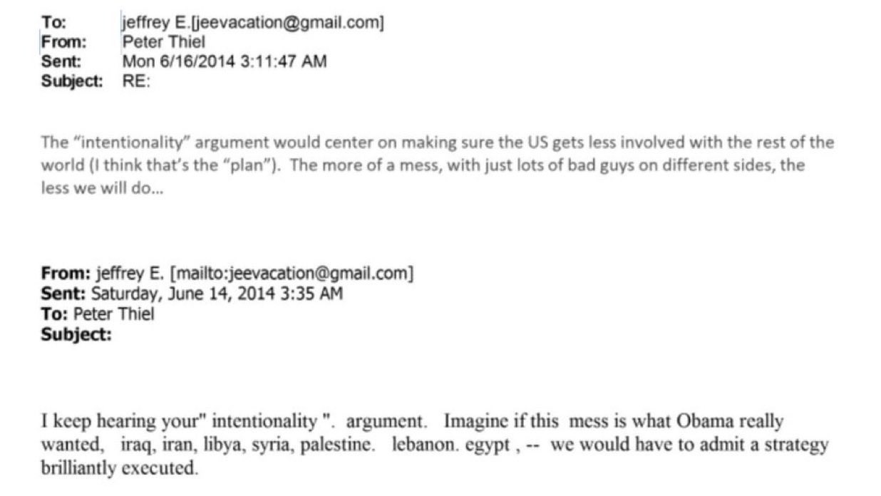 تتضمن الوثائق المنشورة أيضًا رسائل بريد إلكتروني متبادلة بين إبستين وبيتر ثيل، مؤسس شركة بالانتير، تعود إلى عام ٢٠١٤. تكشف هذه الرسائل الإلكترونية أن إبستين وثِيل ناقشا استراتيجية لزعزعة استقرار عدة دول في الشرق الأوسط، من بينها مصر والعراق وإيران وليبيا وسوريا وفلسطين ولبنان. وفي إحدى هذه الرسائل، يقول ثِيل: "كلما ازدادت الفوضى، وازداد عدد الأطراف المتصارعة، قلّ ما علينا فعله".