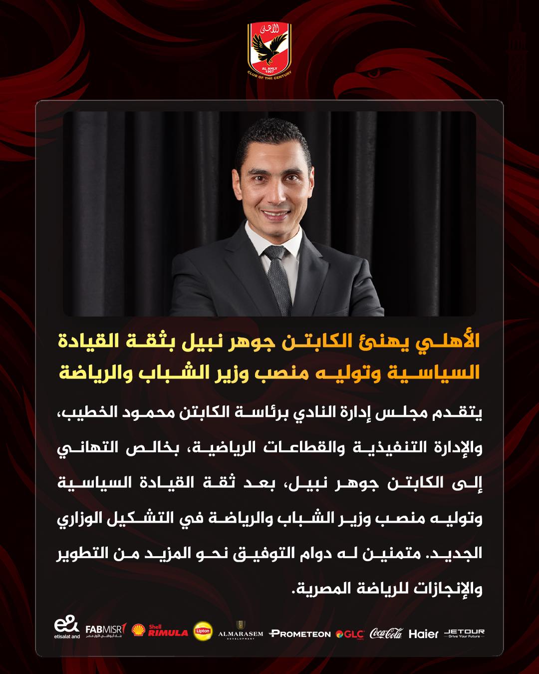 أصدر النادي الأهلي بيانا رسميا، أعلن من خلاله أن مجلس إدارة النادي الأهلي برئاسة محمود الخطيب، إلى جانب الإدارة التنفيذية وكافة القطاعات الرياضية، يتقدمون بالتهنئة للكابتن جوهر نبيل، بمناسبة تعيينه وزيرًا للشباب والرياضة في التشكيل الوزاري الجديد.