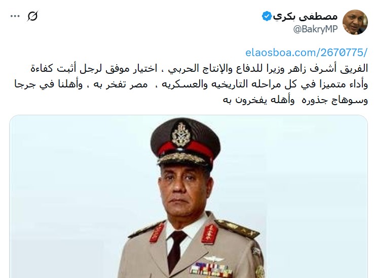 مصطفى بكري: اختيار الفريق أشرف زاهر وزيرا للدفاع موفق لرجل اثبت كفاءة