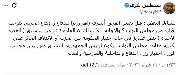 وقد تطرق مصطفى بكري إلى التساؤلات التي رافقت هذا التعيين بشأن ما إذا كان يلزم موافقة مجلس النواب عليه، مؤكدًا أن الدستور المصري واضح في هذا الشأن، وأوضح أن المادة 146 من الدستور، الفقرة الأخيرة، تنص على أنه في حال اختيار الحكومة من الحزب أو الائتلاف الذي يحظى بأغلبية مقاعد مجلس النواب، يكون لرئيس الجمهورية، بالتشاور مع رئيس مجلس الوزراء، الحق في اختيار وزراء الدفاع والداخلية والخارجية والعدل مباشرة، دون الحاجة لعرضهم على البرلمان.