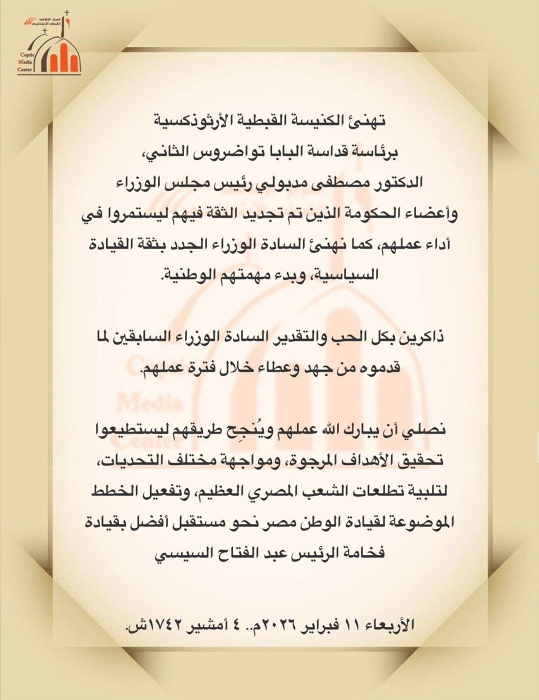 بيان الكنيسة القبطية الصادر اليوم حمل تهنئة رسمية من الكنيسة القبطية الأرثوذكسية برئاسة قداسة البابا تواضروس الثاني إلى الدكتور مصطفى مدبولي رئيس مجلس الوزراء، وأعضاء الحكومة الذين تم تجديد الثقة فيهم، إلى جانب الوزراء الجدد بعد أدائهم اليمين الدستورية. وجاء البيان ليؤكد دعم الكنيسة لمسيرة العمل الوطني خلال المرحلة المقبلة.
