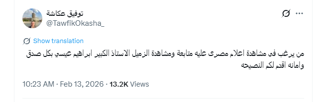 وقال توفيق عكاشة في تغريدة عبر منصة «إكس»: "من يرغب في متابعة إعلام يقدم الحقيقة والأخبار بأمانة، عليه متابعة الزميل الكبير إبراهيم عيسي، نصيحتي لكم بمشاهدته بصدق".