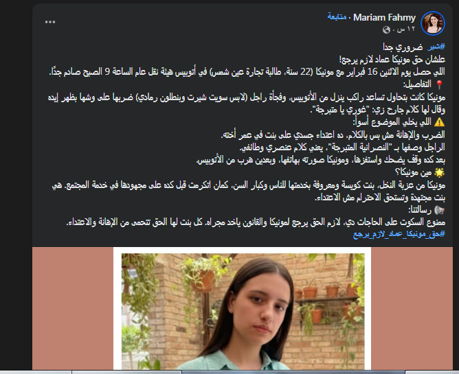تأكيدًا على حق كل فتاة في الحماية والكرامة، دعا الجمهور السلطات لتطبيق القانون بكل حزم، ومحاسبة المعتدين، وإعادة الحق لمونيكا عماد، مؤكّدين أن السكوت على مثل هذه الجرائم يُشجع على تكرارها، وأن العدالة يجب أن تأخذ مجراها دون تأجيل.