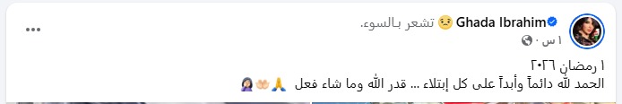 أعلنت الفنانة غادة إبراهيم لجمهورها عبر حسابها الرسمي على فيسبوك عن تعرض سيارتها لحادث سير في اليوم الأول من شهر رمضان المبارك لعام 2026. وحرصت غادة إبراهيم على طمأنة متابعيها، قائلة: "الحمد لله دائمًا وأبدًا على كل ابتلاء، قدر الله وما شاء فعل"، مصورة حجم الأضرار التي لحقت بالسيارة.