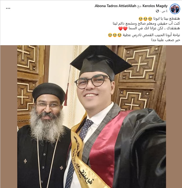 "هتقطع بينا يا أبونا… كنت أب حقيقي ومعلم صالح ومشجع دائم لينا… هنفتقدك لكن عزانا إنك في السما… نياحة أبونا الحبيب القمص تادرس عطية… خبر صعب علينا جدًا".