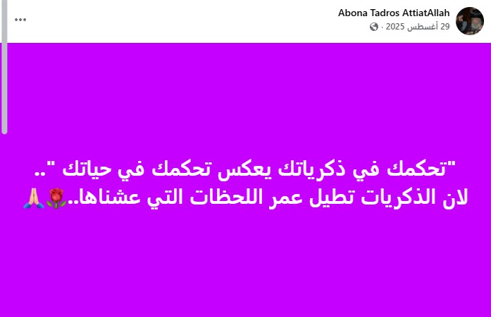 ومن بين أكثر ما لفت انتباه محبيه، كان آخر منشور للقمص تادرس عطية الله على صفحته الشخصية، والذي نشره يوم 29 أغسطس 2025، وجاء فيه: