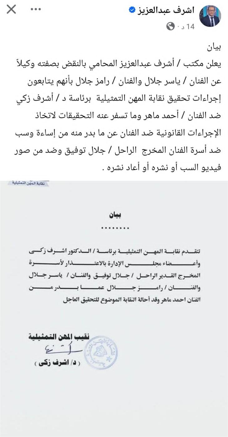 وعلى الفور، أصدرت النقابة بيانًا رسميًا أعربت فيه عن اعتذارها لأسرة المخرج الراحل جلال توفيق، مؤكدة احترامها الكامل لتاريخه الفني، كما أعلنت إحالة الواقعة إلى التحقيق العاجل وفق اللوائح المنظمة لعملها.