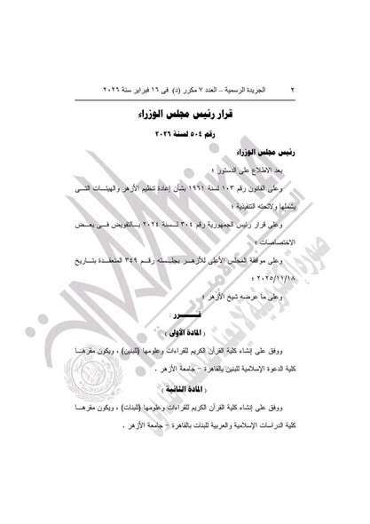 نشرت الجريدة الرسمية اليوم الأربعاء قرارًا تاريخيًا بشأن إنشاء كلية متخصصة لدراسة القرآن الكريم للقراءات وعلومها، لتوفير بيئة أكاديمية متكاملة لتعليم علوم القرآن للطلاب والطالبات في إطار جامعات الأزهر الشريف.