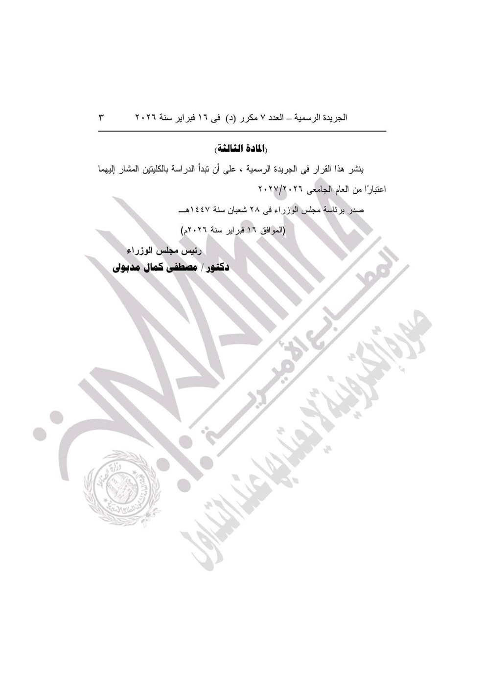 حددت المادة الثالثة بدء الدراسة بالكليتين اعتبارًا من العام الجامعي 2026/2027، كما شدد القرار على نشره رسميًا في الجريدة الرسمية لضمان إعلان القرار على نطاق واسع وتفعيل العمل بالكليتين فورًا.