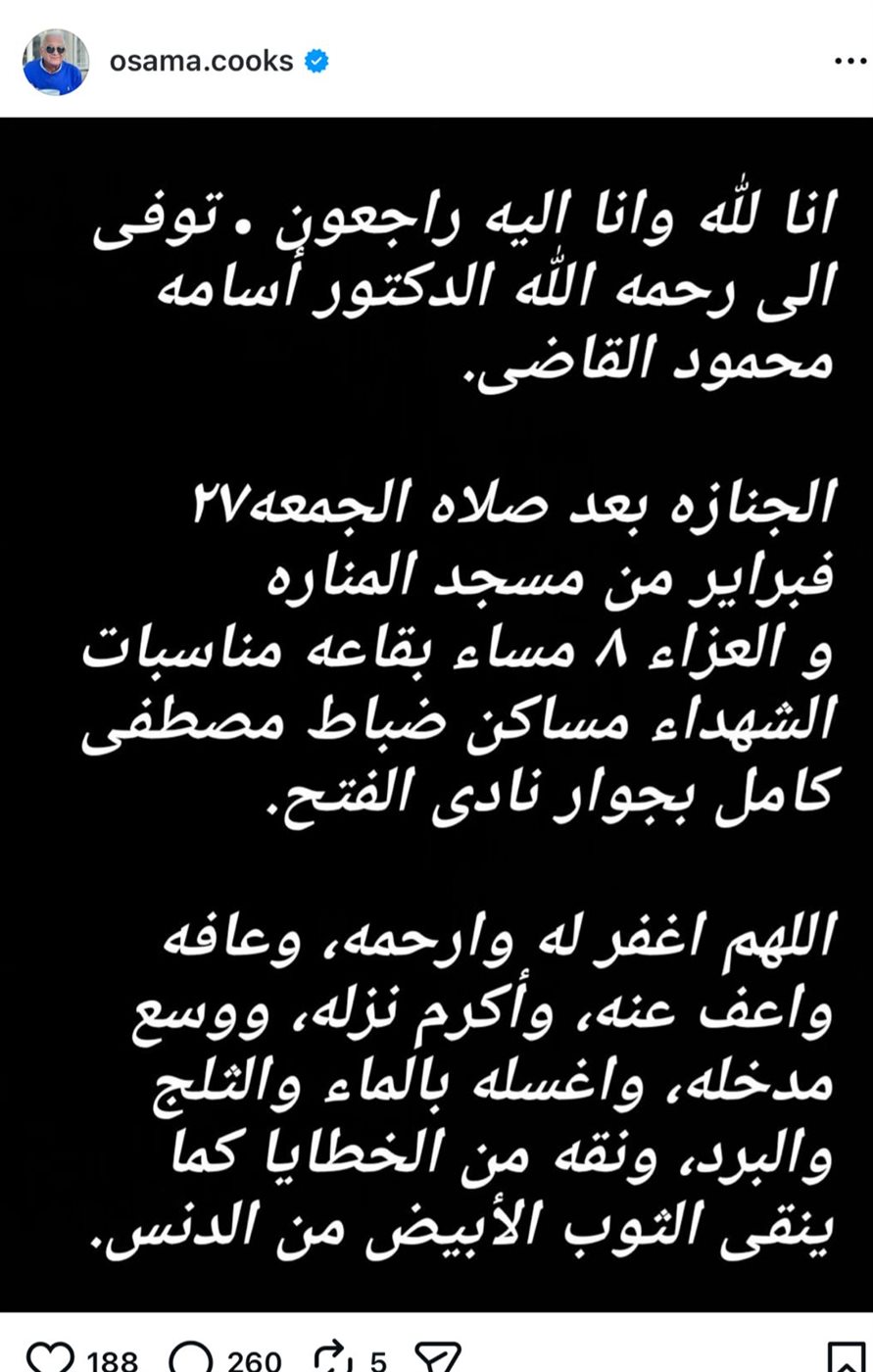 وفاة الشيف أسامة القاضي أسطورة الطهي ومؤثر محتوى الطعام علي المواقع والجنازة بعد صلاة الجمعة