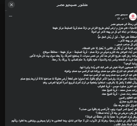 استغاثة عاجلة من أسرة مسيحية بعد الاستيلاء بالقوة على منزل وأرض مريض قعيد في سوهاج