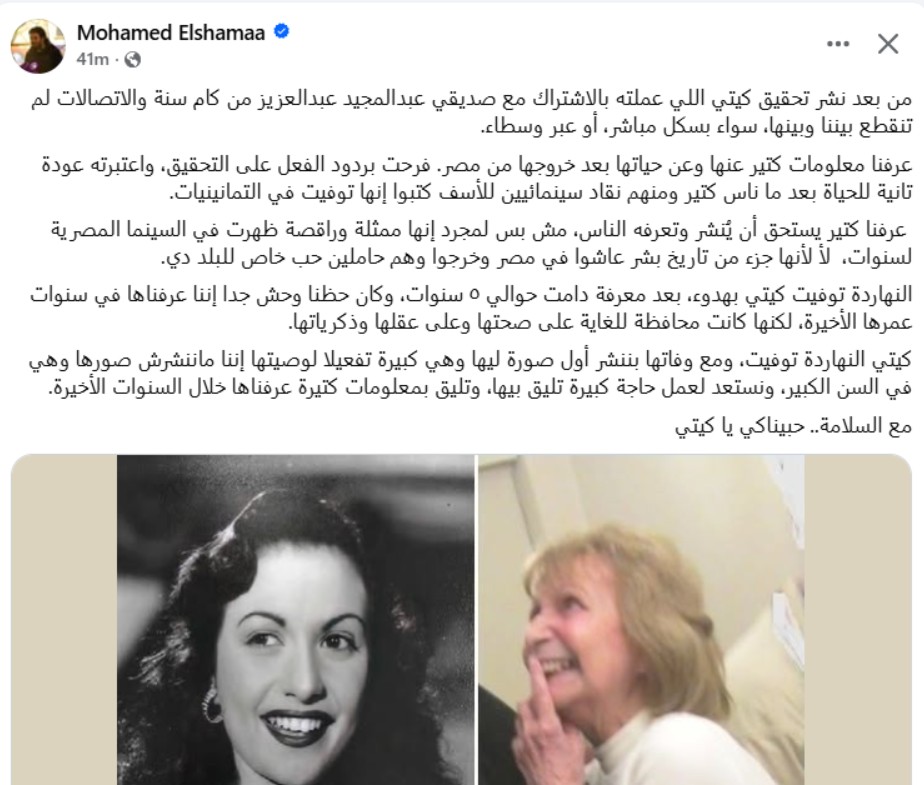 الصحفي محمد الشماع كتب عبر صفحته على فيسبوك منشورًا أكد فيه خبر وفاة الفنانة كيتي عفريتة إسماعيل ياسين، مشيرًا إلى تواصله معها خلال السنوات الأخيرة، وكاشفًا أن كثيرين كانوا يعتقدون خطأً أنها توفيت منذ عقود.