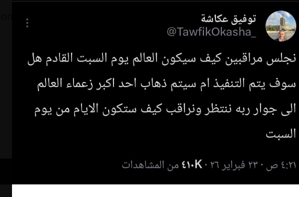 وقال عكاشة في تغريدته: "نجلس مراقبين كيف سيكون العالم يوم السبت القادم، هل سيتم التنفيذ أم يذهب كبار زعماء العالم إلى جواز ربهم، ننتظر ونراقب كيف ستكون الأيام".