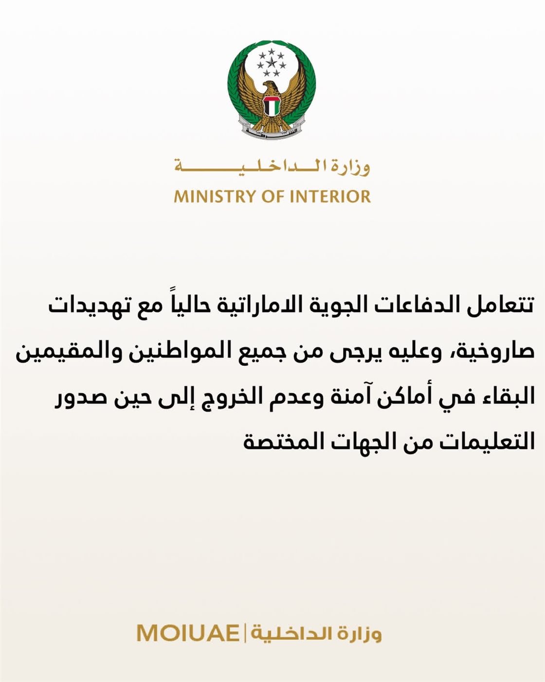 تواصل وزارة الداخلية الإماراتية مراقبة الوضع عن كثب وإصدار التعليمات العاجلة للمواطنين والمقيمين، لضمان الالتزام بإجراءات السلامة، مع توخي الحذر الكامل في الأماكن المفتوحة والمباني المكشوفة حتى انحسار التهديدات.