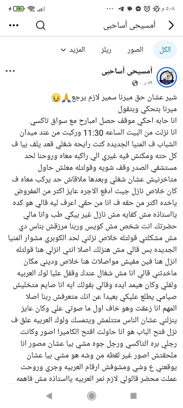 منشور ميرنا سمير.. وواقعة طفلة الأنسولين… هناك منشور متداول لفتاة تدعى ميرنا سمير، أوضحت أن هناك سائق تاكسي قام بالاعتداء عليها بسبب رغبته في زيادة الأجرة على الرغم من أنه لا يستحق ذلك بسبب مسافة المشوار، وتم تداول منشور الفتاة ميرنا سنير التي تستغيث فيه.