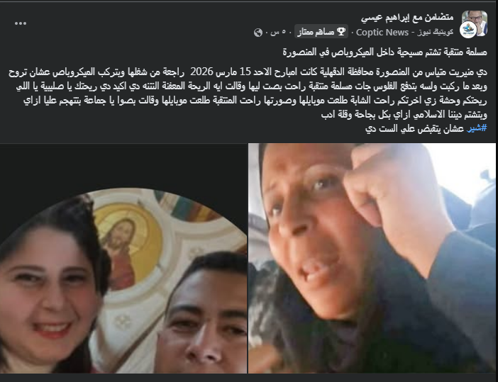 إهانة منيريت متياس في ميكروباص بالمنصورة:مسلمة منتقبة تهاجم مسيحية بعبارات جارحة في الميكروباص وتوثق الحادثة