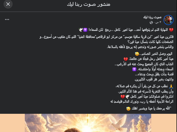 بعد أسبوع من البحث المستمر، جاء الخبر الذي هز القلوب. مينا أمير كامل، الشاب الذي كان الجميع يبحث عنه في الأرض، لم يعد إلى بيته، بل السماء كانت هي من وجدته أولًا. رحل الشاب فجأة، وكانت هذه النهاية التي لم يتوقعها أحد، وكان هذا الخبر مؤلمًا جدًا لعائلته وأصدقائه وأهل قريته الذين عاشوا أيامًا من القلق المستمر.