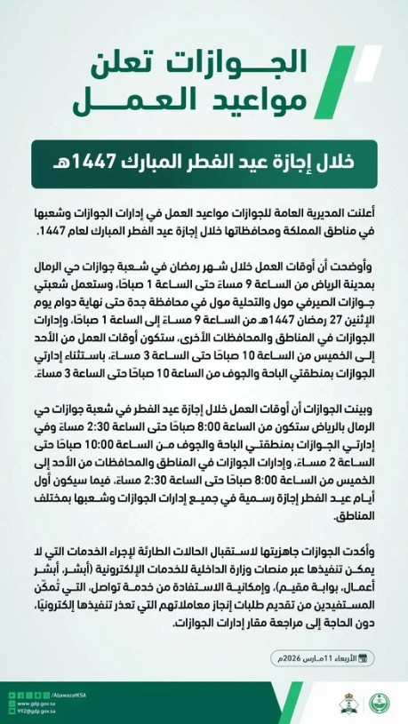 وفي الوقت نفسه، أكدت المديرية العامة للجوازات أن أول أيام عيد الفطر المبارك سيكون إجازة رسمية في جميع إدارات الجوازات وشعبها المنتشرة في مختلف مناطق المملكة.