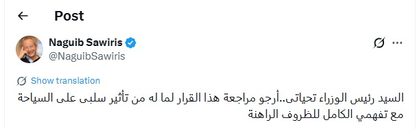 وفي تغريدة له عبر حسابه الرسمي على منصة "إكس"، عبّر ساويرس عن قلقه من الأثر السلبي للقرار على قطاع السياحة، مؤكّدًا تفهمه الكامل للظروف التي تمر بها البلاد، لكنه شدد على أهمية مراعاة التوازن بين الإجراءات الاحترازية والاقتصاد الوطني.