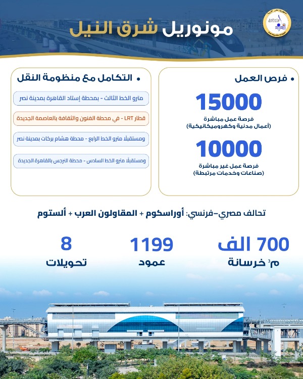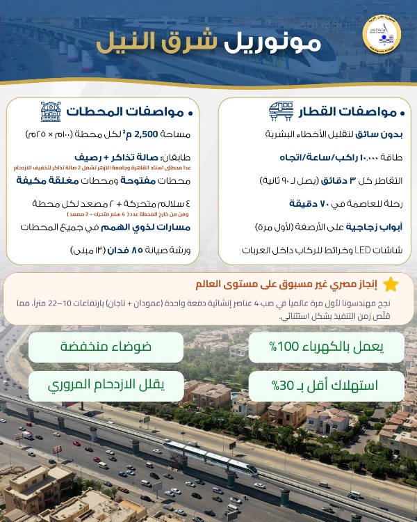 مونوريل شرق النيل ينطلق بـ22 محطة بعد افتتاحه ليقدم خدمات جديدة للمواطنين في القاهرة