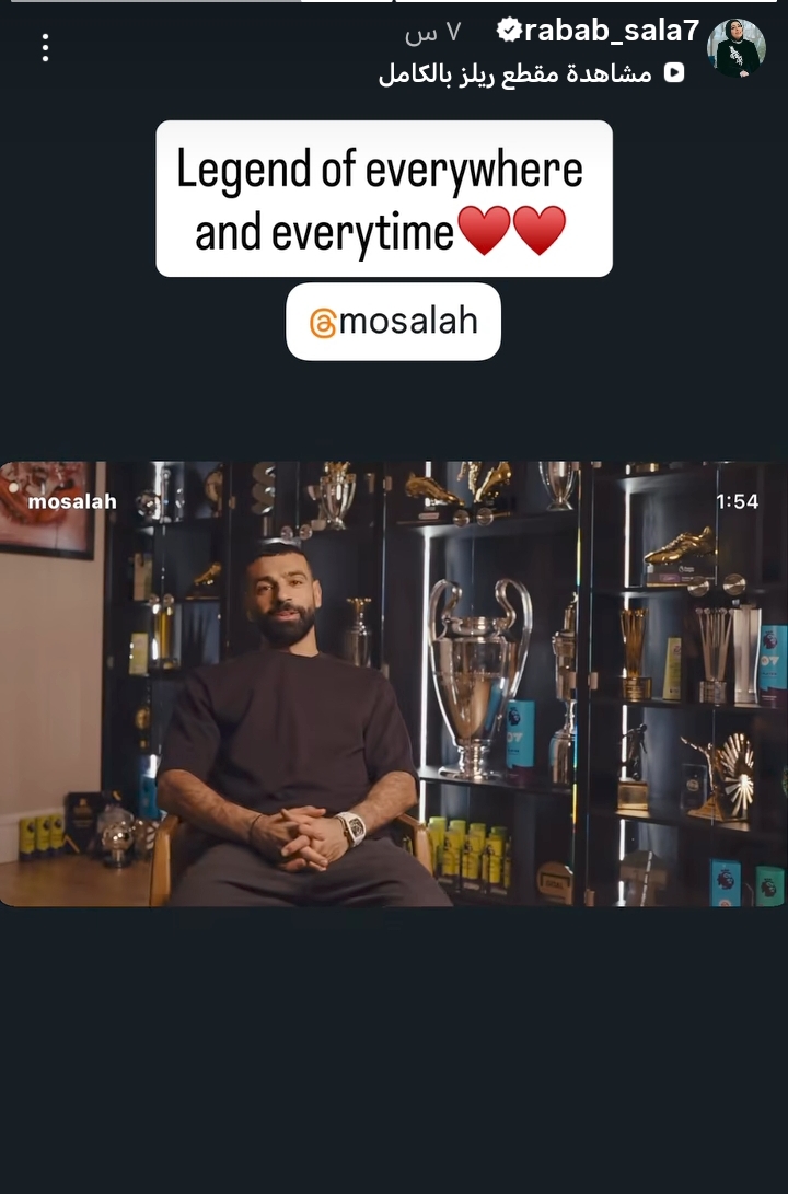 علقت شقيقته رباب صلاح عبر حسابها الرسمي على “إنستجرام” على رحيله، وكتبت: “أسطورة في كل مكان وفي كل وقت”، مؤكدة أن صلاح سيظل رمزًا للإبداع والالتزام داخل الملعب وخارجه، وترك إرثًا سيستمر في ذاكرة جماهير ليفربول ومحبيه حول العالم.