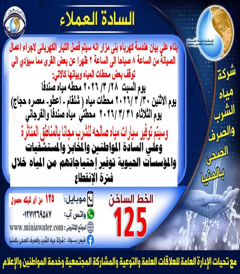 كما أعلنت محافظة المنيا عن انقطاع المياه والكهرباء لمدة ثلاثة أيام، بدءًا من غدٍ السبت، ليشمل عدة مناطق في المحافظة ومدينة بني مزار.