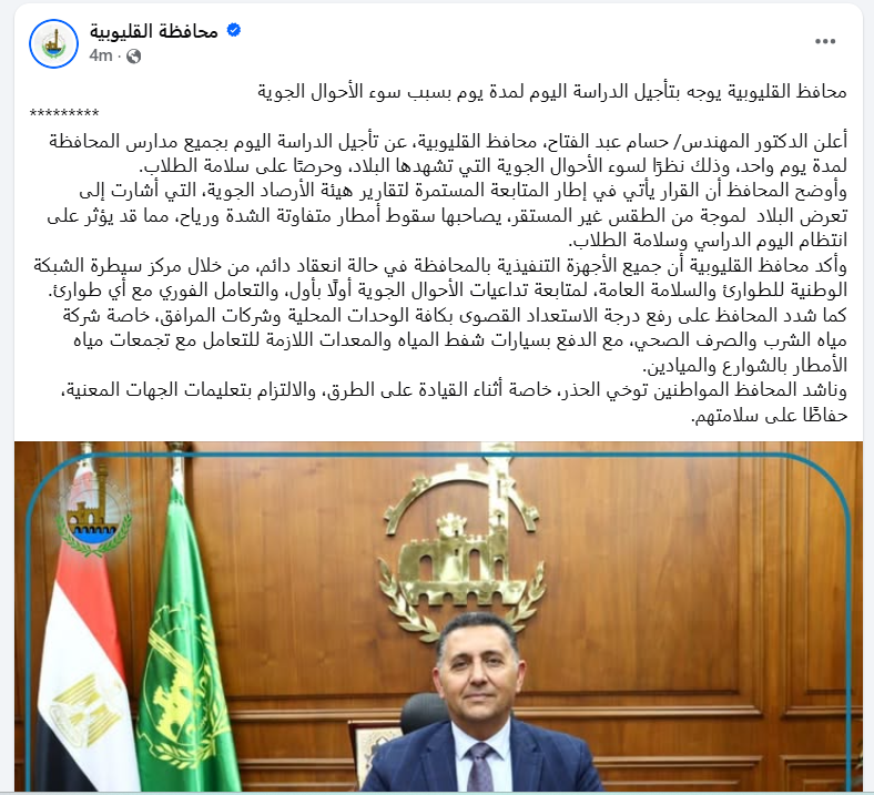 تعطيل الدراسة اليوم في القليوبية بقرار رسمي بسبب سوء الأحوال الجوية وسقوط الأمطار وموقف المحافظات الأخري