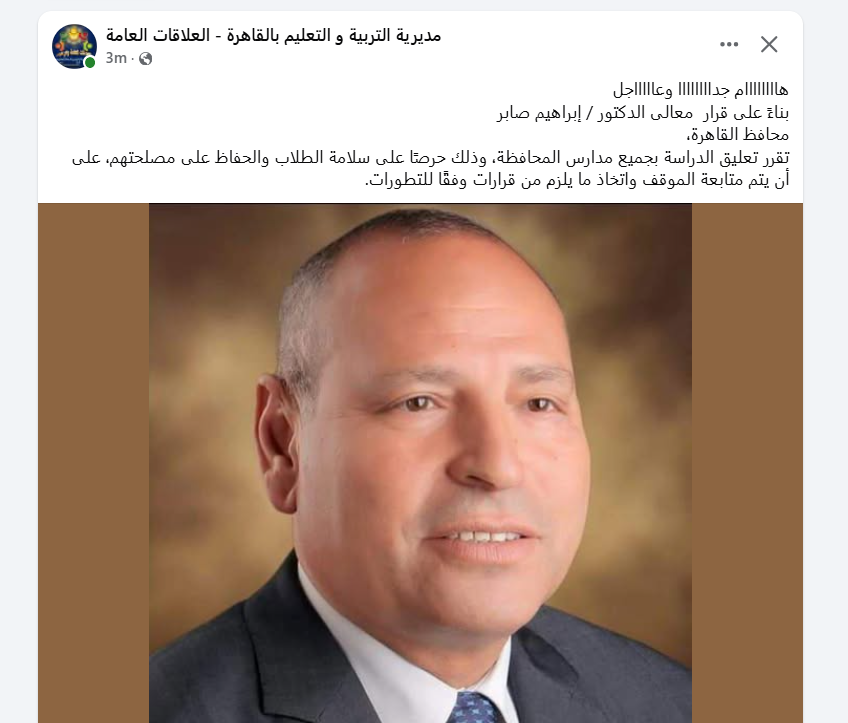 وفي السياق ذاته، أعلنت محافظة الجيزة تعطيل الدراسة اليوم بجميع المدارس، بقرار من أحمد الأنصاري، لمدة يوم واحد.