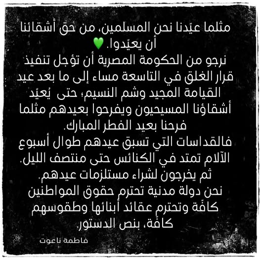 واختتمت الكاتبة “فاطمة ناعوت” رسالتها بالتأكيد على أن مصر دولة مدنية تحترم حقوق جميع مواطنيها، وتكفل حرية ممارسة الشعائر الدينية وفقًا لنصوص الدستور، داعية إلى مراعاة هذا المبدأ في القرارات التنفيذية، خاصة في أوقات الأعياد والمناسبات الدينية.