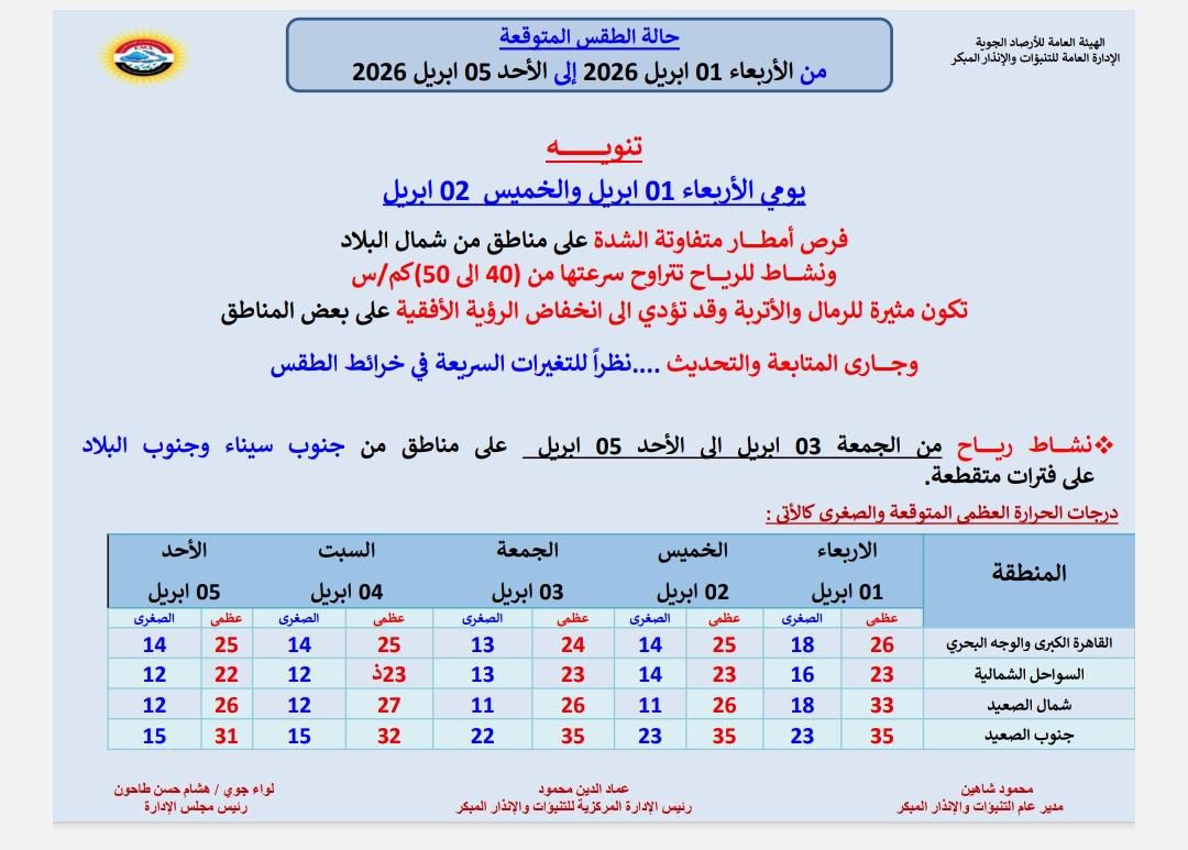 وفقًا لأحدث بيانات الهيئة العامة للأرصاد الجوية، من المتوقع امتداد منخفض جوي مصحوب برطوبة نسبية مرتفعة خلال يومي الأربعاء والخميس، ما قد يؤدي إلى سقوط أمطار متفاوتة الشدة في بعض المناطق، مع نشاط للرياح المثيرة للرمال والأتربة، وارتفاع نسبي في درجات الحرارة. وتشير الهيئة إلى أن حالة الطقس ستكون متقلبة نظرًا لطبيعة فصل الربيع.