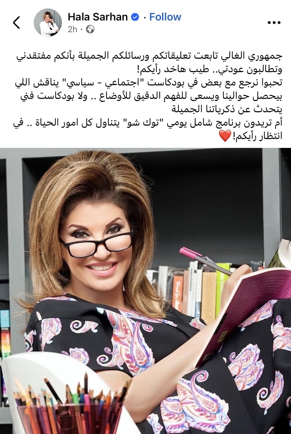 نشرت الإعلامية هالة سرحان عبر حسابها الرسمي على موقع «فيسبوك» رسالة تفاعلية مع جمهورها، أكدت خلالها أنها تابعت تعليقات ورسائل المتابعين الذين أبدوا اشتياقهم لعودتها.