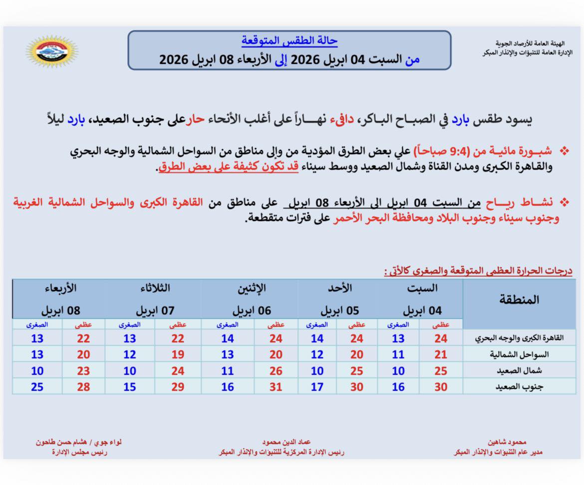 جدير بالذكر ان قرار تعطيل الدراسة يبقي مرتبطًا بالتقارير الرسمية الصادرة عن هيئة الأرصاد الجوية، وكذلك تقديرات المحافظين ووزارة التربية والتعليم. وحتى الآن، لا يوجد ما يؤكد تعطيل الدراسة الأسبوع المقبل، مع استمرار المتابعة لحظة بلحظة لأي تطورات جديدة.