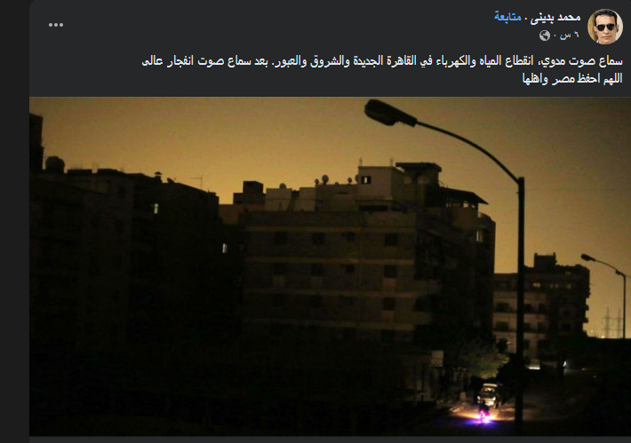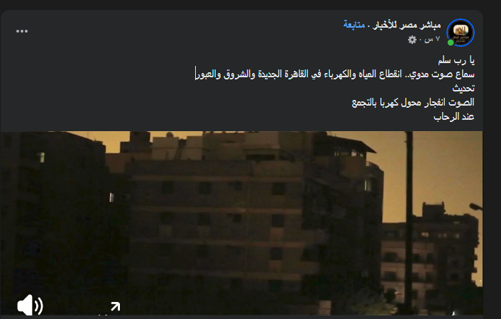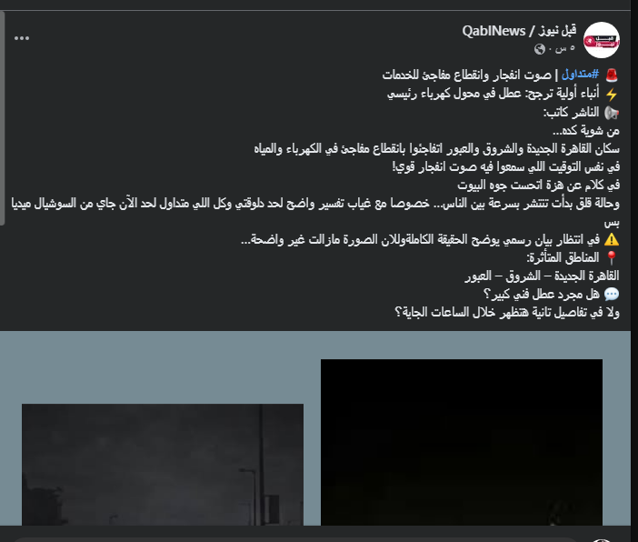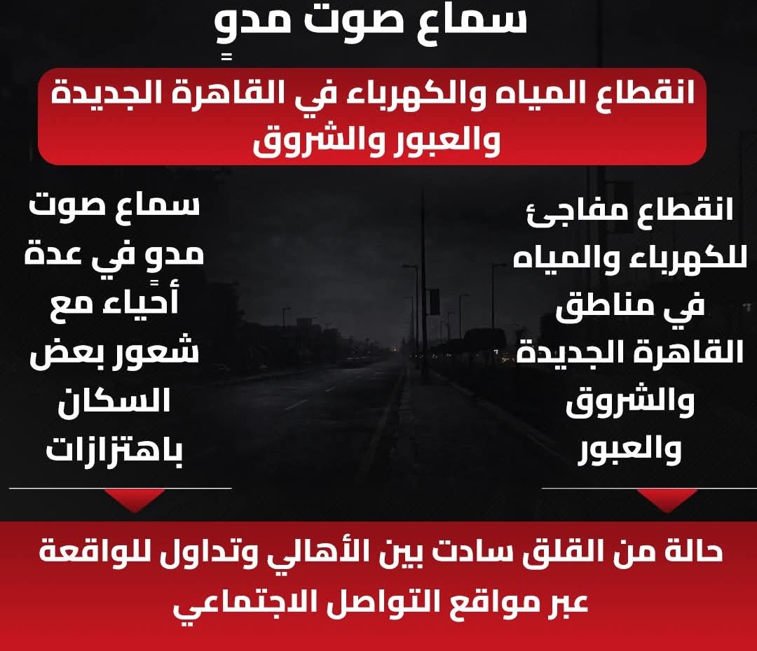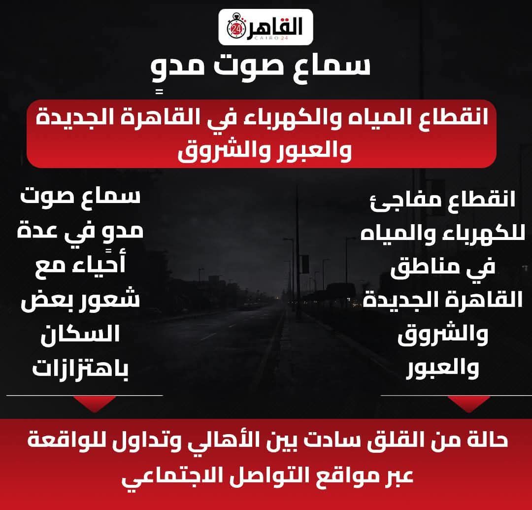 انتشرت الساعات القليلة الماضية منشورات بشكل كبير يفيد بسماع دوي انفجار، وقالت الانباء ان عدة مناطق في القاهرة الجديدة والعبور والشروقـ شهدت منذ ساعات قليلة انقطاعًا مفاجئًا في خدمات الكهرباء والمياه، ما أثار حالة من الذعر بين السكان، خاصة بعد سماعهم صوتًا مدويًا مصحوبًا بهزات أرضية، دون أن تتضح أسباب هذه الأحداث حتى الآن.