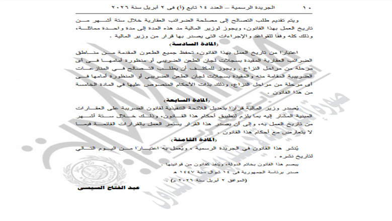 قرار رئاسي بتعديل قانون الضريبة العقارية 2026 ونشره رسميًا بالجريدة الرسمية