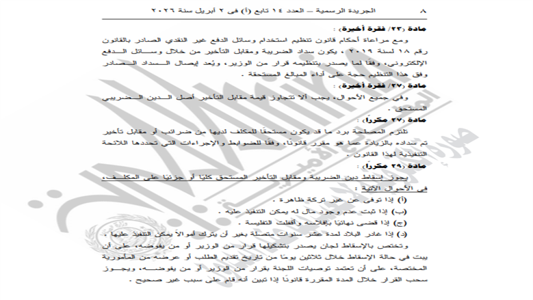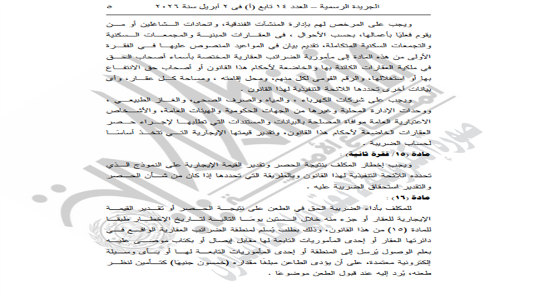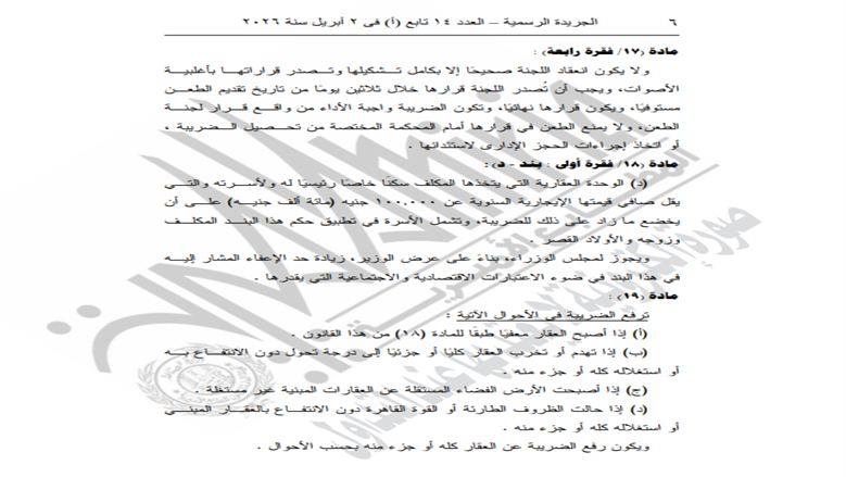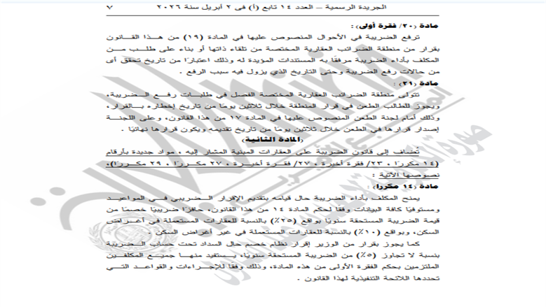 كما شمل تعديل قانون الضريبة العقارية 2026 تعديلات جوهرية على عدد من المواد، من بينها المواد 4 و14 و15 و16 و17 و18 و19 و20 و21، بما يعكس توجه الدولة نحو تطوير آليات التقييم والحوكمة داخل المنظومة الضريبية.