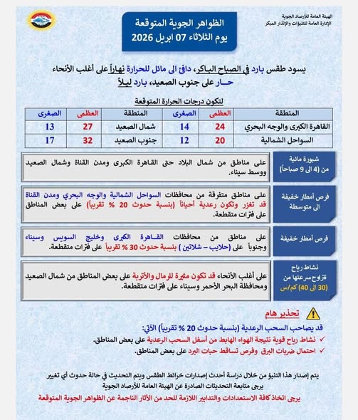 نشاط رياح (30 إلى 40 كم/س): على أغلب الأنحاء، قد تكون مثيرة للرمال والأتربة على بعض المناطق من شمال الصعيد ومحافظة البحر الأحمر وسيناء على فترات متقطعة".