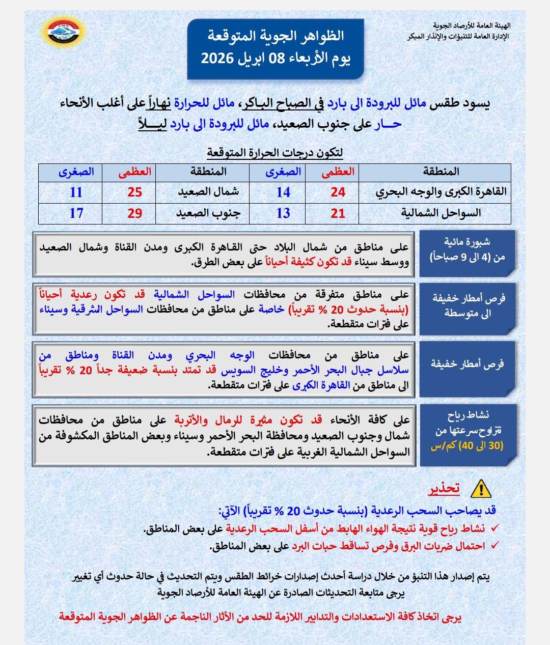 حالة الطقس غدًا الأربعاء 8 أبريل 2026: شبورة كثيفة وأمطار رعدية وتحذيرات من رياح مثيرة للأتربة