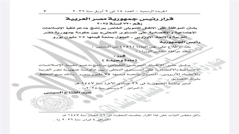 نشرت الجريدة الرسمية، في عددها الصادر اليوم، القرار رقم 730 لسنة 2026 لرئيس الجمهورية، والذي يوافق بموجبه على الاتفاق التمويلي المبرم بين الحكومة المصرية والاتحاد الأوروبي.