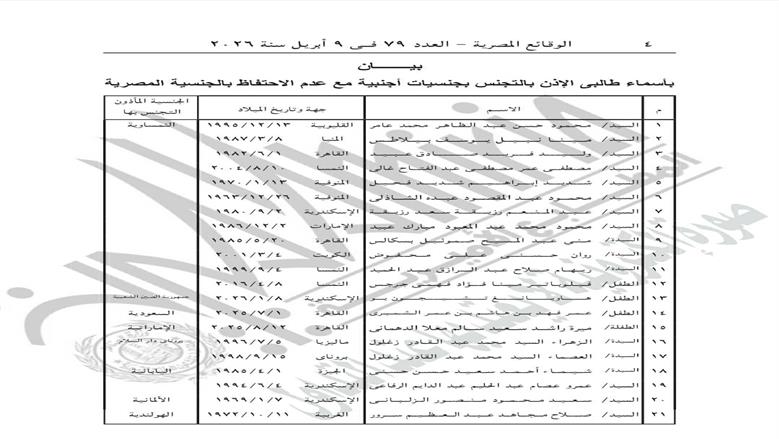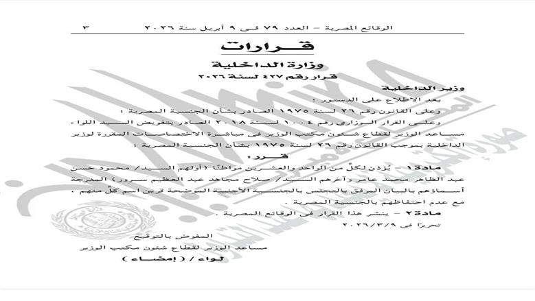 أصدرت وزارة الداخلية المصرية قرارًا مهمًا يتعلق بالجنسية المصرية، حيث تم نشر القرار في جريدة الوقائع المصرية، العدد 79 بتاريخ 9 أبريل 2026. ويتضمن القرار إجراءات قانونية بسحب الجنسية المصرية من مجموعة من المواطنين الذين حصلوا على جنسيات أجنبية دون الاحتفاظ بالجنسية الأصلية.