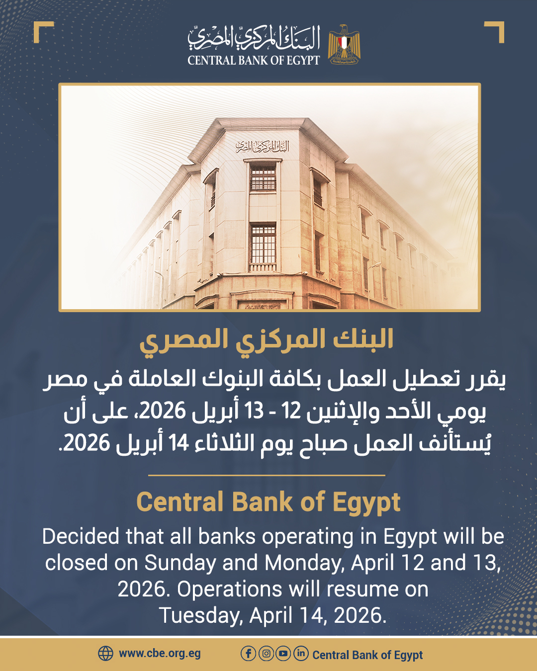 أوضح البنك المركزي أن العمل في جميع البنوك سيعود يوم الثلاثاء 14 أبريل 2026. ودعا البنك عملاءه إلى مراعاة هذا التاريخ عند التخطيط لإجراء أي معاملات مالية أو مصرفية، لضمان استمرارية الخدمات دون انقطاع.