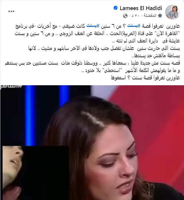 سلطت الإعلامية لميس الحديدي الضوء على جانب مهم من القصة، مؤكدة أن سيدة الإسكندرية "س" كانت قد ظهرت معها في لقاء تلفزيوني سابق منذ عدة سنوات، ضمن حلقة ناقشت العنف الأسري.